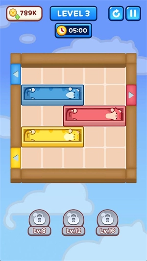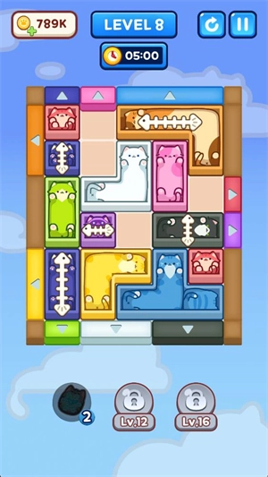 3、当方块移动到对应颜色的区域后,猫咪就能离开;当所有方块里的猫猫都成功逃脱,即可通关。