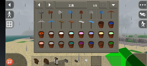 5、点击屏幕左侧的“田”字图标即可打开背包界面,里面有铁镐、斧头等大量高阶工具,这些工具都能用来触发连锁采集效果。