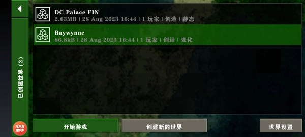 3、回到主菜单,点击“”选项,选中名为Baywynne的预设存档,点击“开始”进入游戏世界;