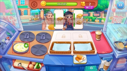 3、制作煎饼的过程中,右上角的绿色圆圈会显示煎饼即将成熟的倒计时,红色圆圈则会提醒你煎饼快要烧焦的时间。你得在恰当的时机完成制作,并且赚取到足够的金币,才能结束一天的营业。