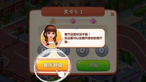 4、玩家在抵达5-1关卡时,餐厅升级功能会自动解锁。点击此选项后,可使用获得的金币购置更精良的食材,解锁全新厨具,从而提升餐厅的整体水准。