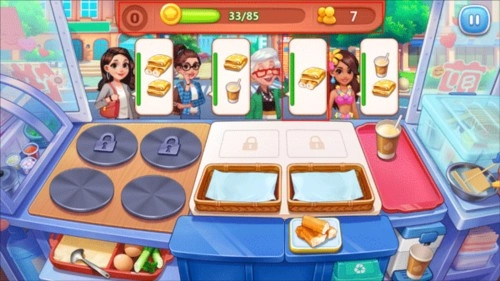 2、按照客人的口味偏好来制作他们喜爱的煎饼。要留意的是,屏幕右侧的绿色进度条显示的是客人的耐心程度,一旦它变成红色,就意味着客人已经十分不满了。