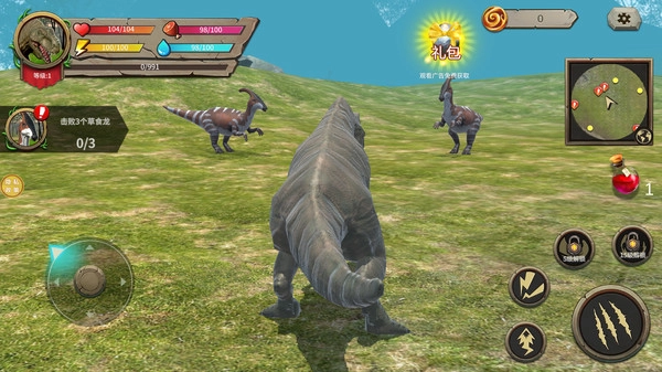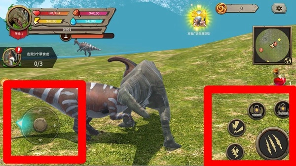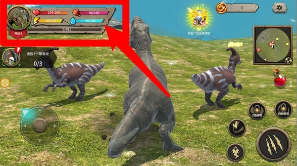 2.界面信息:屏幕左上角会呈现恐龙的血量、体力以及水分数值,玩家需要随时留意这些数值的变化,以保障恐龙能够在荒野环境中维持稳定的生存状态。