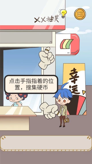 第1关:从包里拿到1个“我要当有钱人”,再从头顶的牌匾上获取一个硬币,这两样加起来正好够买,之后就可以去大妈那里兑换大奖了。