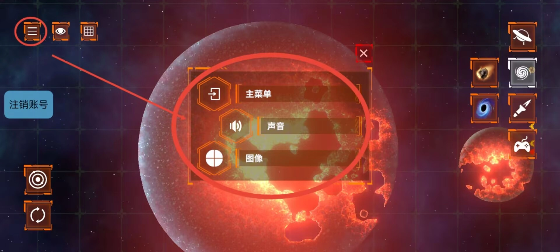 3、点击菜单按钮进入暂停界面后,可进行返回主界面、调整音效、设置画面参数等系统相关操作。