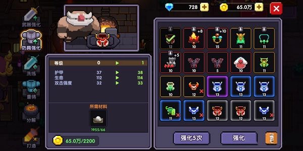 5、铁匠铺:在铁匠铺里,能够对装备开展升级操作,涵盖武器强化、防具强化、武器属性洗练、防具属性重铸、装备分解以及武器打造这些项目。