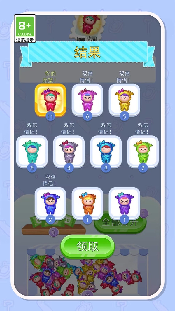 3.玩家可点击“全部打开”按钮,一键开启多个盲袋来收集果冻人角色,丰富个人收藏,增添游戏乐趣。