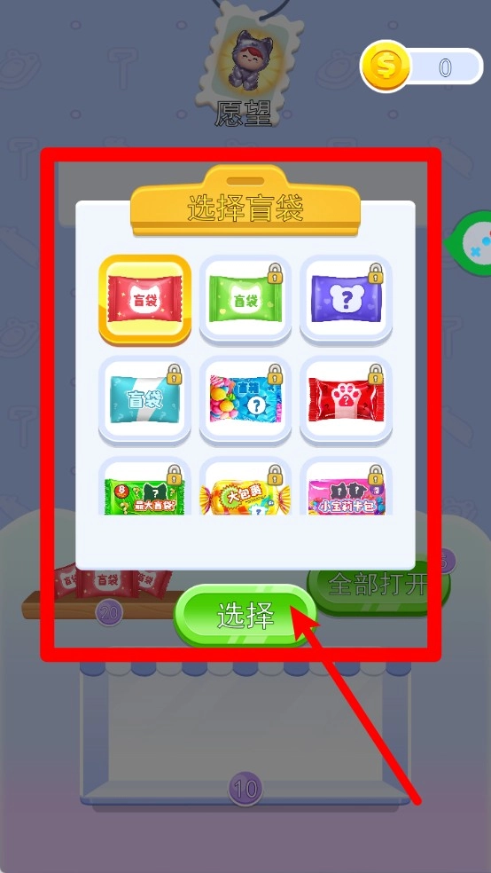 2.在挑选盲袋时,玩家能够选择开启不同的袋子,每个盲袋里都装有不一样的果冻角色,点击“选择”按钮就能查看并开启。