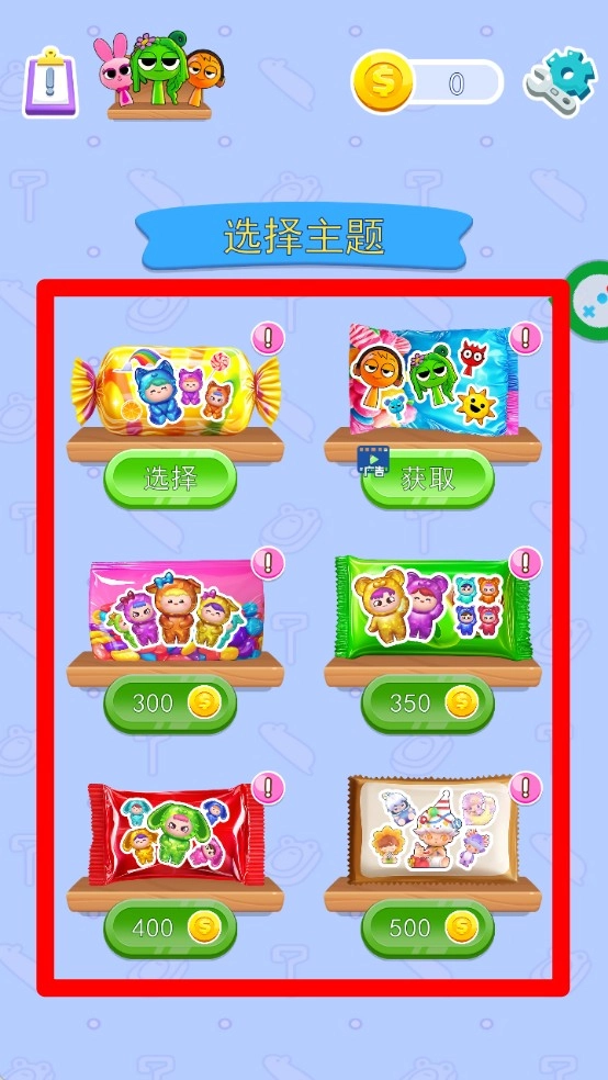 1.玩家能够挑选不同的果冻主题包,点击“选择”按钮即可解锁每个主题包,每个主题包都包含着各异的果冻角色。