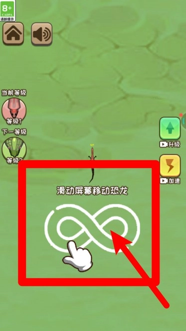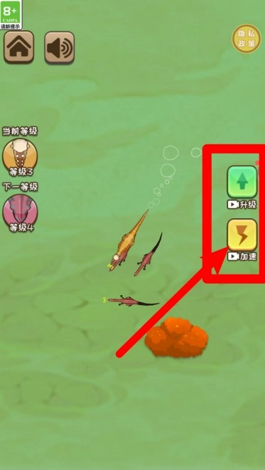 1.点击右侧按钮,可选择通过观看广告来实现升级或加速,助力你更快提升恐龙等级并提高移动效率。