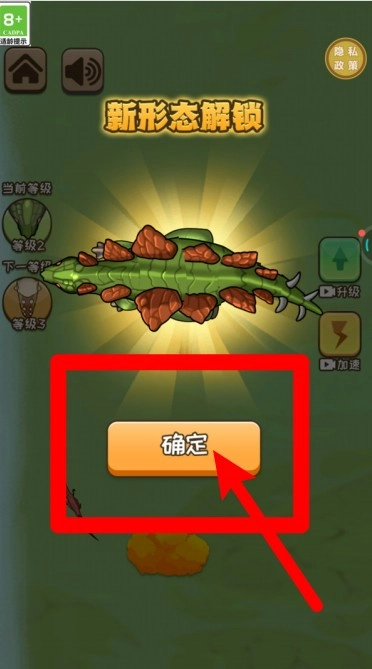 2.完成进化阶段后,新的恐龙形态会自动解锁,点击“确定”按钮就能确认外观的变化并继续下一步。