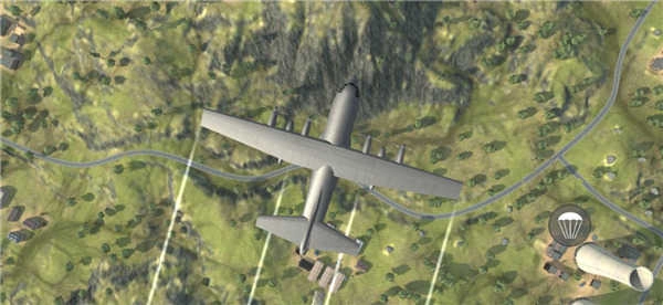 5、进入如图所示的场景后,玩家将乘坐飞机参与大逃杀玩法,届时点击右下角的降落伞按钮即可。