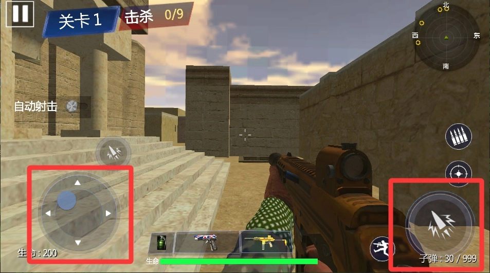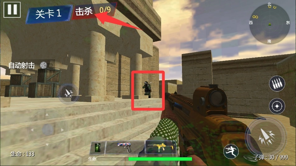 4、长按射击键进入瞄准状态,当准星变为红色时松开手指即可实现爆头击杀,连续消灭五个目标能触发慢动作特效。