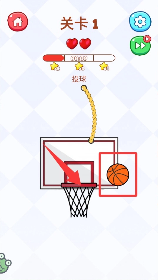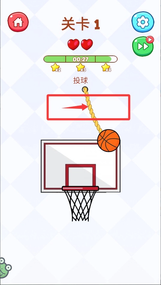 3、成功清除障碍后会出现篮球发射装置,调整角度并点击投掷按钮将球准确送入篮筐完成趣味互动。