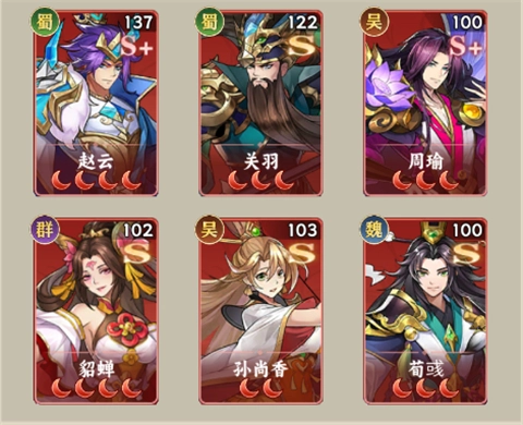 1、赵云+关羽+周瑜+貂蝉+孙尚香+荀彧