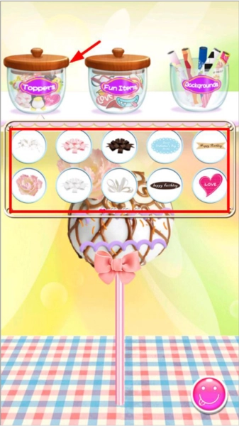 9、棒棒糖蛋糕的基础部分已经完成了,但这还只是开始,玩家还能为蛋糕增添更多细节,通过点击选择不同的蛋糕装饰,就能制作出超漂亮精美的棒棒糖蛋糕。