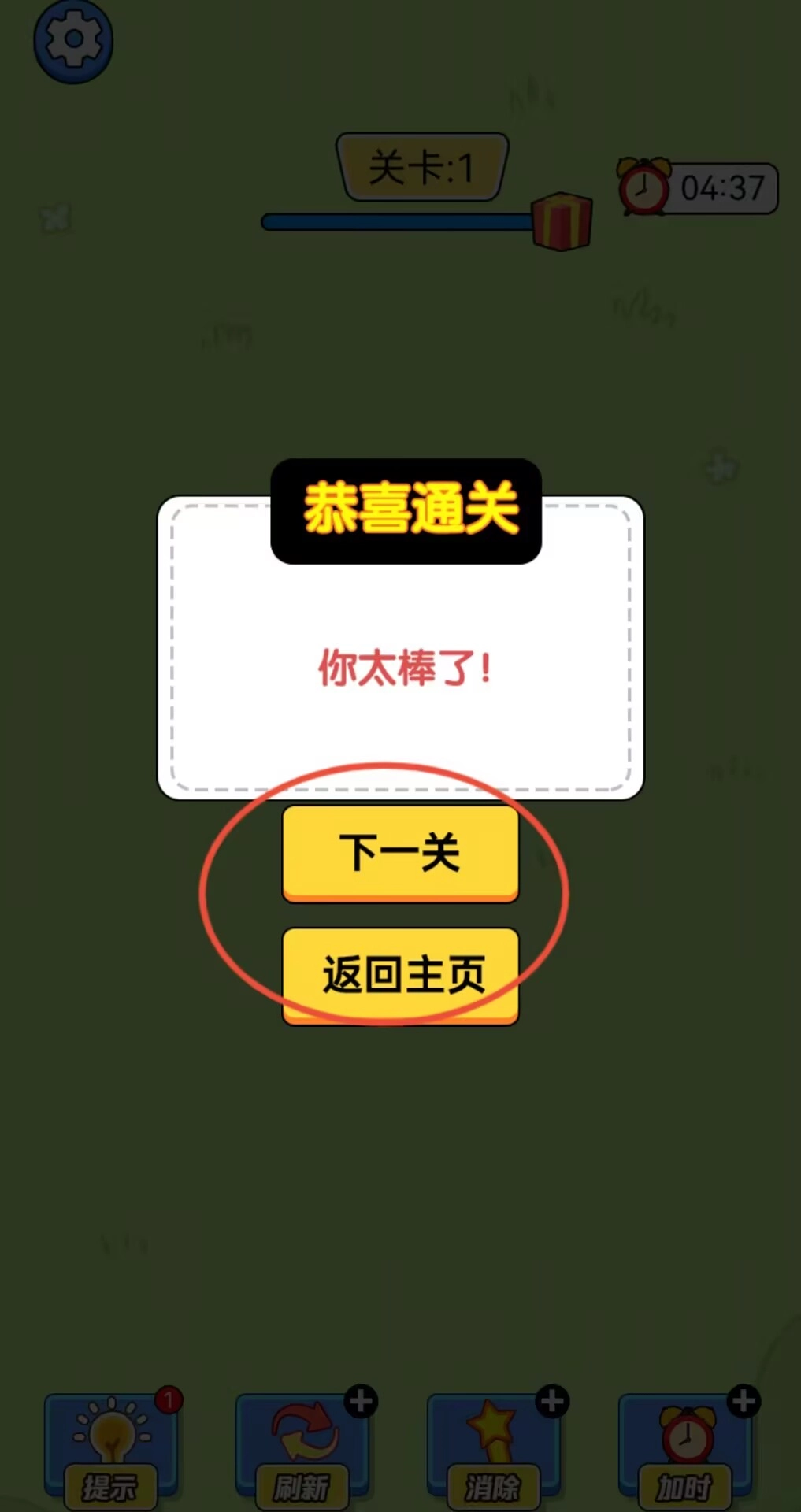 3、持续完成消除任务,直到进度条填满就可以通关,结算界面会提供进入下一关或返回主界面的选项。