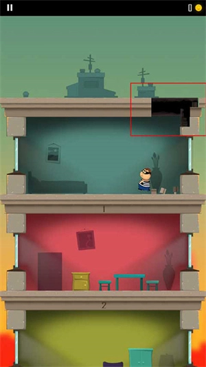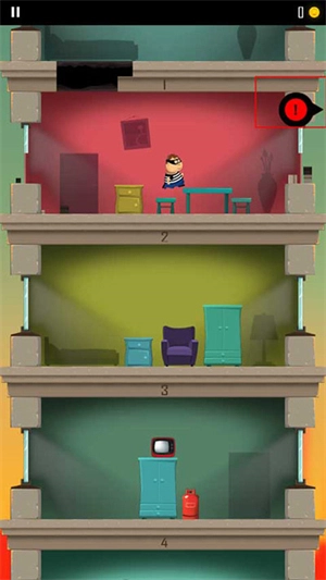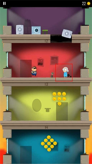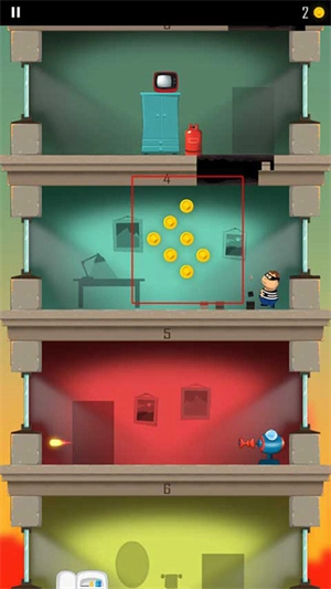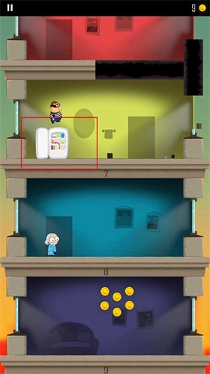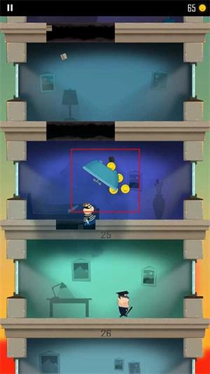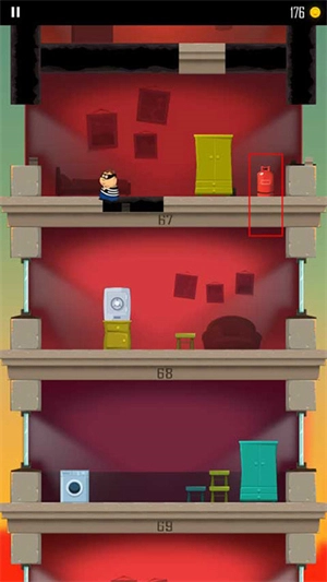 1、游戏开始时会有一个小偷跑到另一层楼,玩家需要操控角色以屁股着地的方式破开楼层,从而不断抵达下方的楼层。