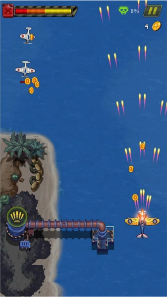 3、进入战斗环节,你可以通过滑动屏幕来操控战斗机的移动,同时射击前方出现的敌机,将其击败后就能收集到金币。