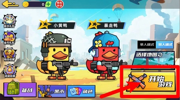 1.初始界面:挑选心仪的鸭鸭角色开启双人模式,点击启动按钮即可马上开启紧张刺激的对战。