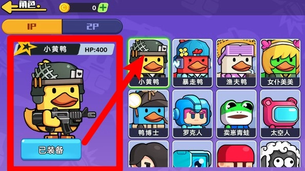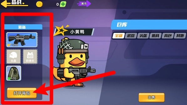 2.角色背包系统:点击背包按钮即可快速查看和切换武器装备,以此强化鸭鸭的战斗能力,助力其迎战敌人。