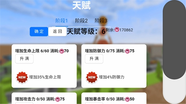 角色天赋系统:设计有角色天赋加点选择界面,玩家可消耗宝石提升角色的天赋属性,而宝石需通过通关关卡来获取。