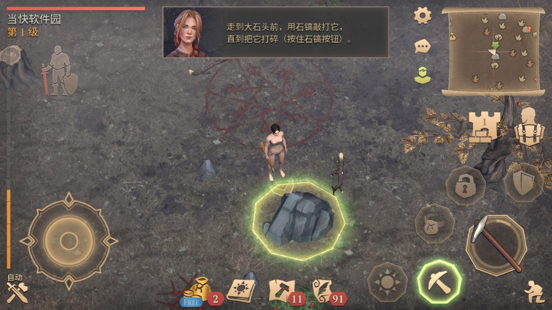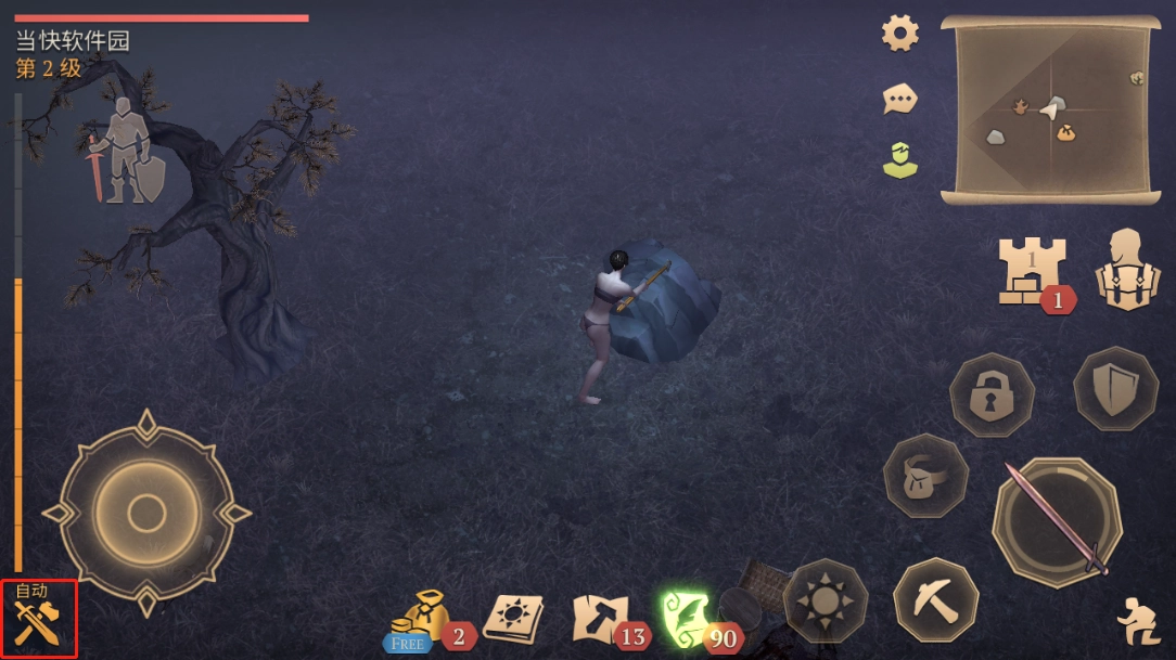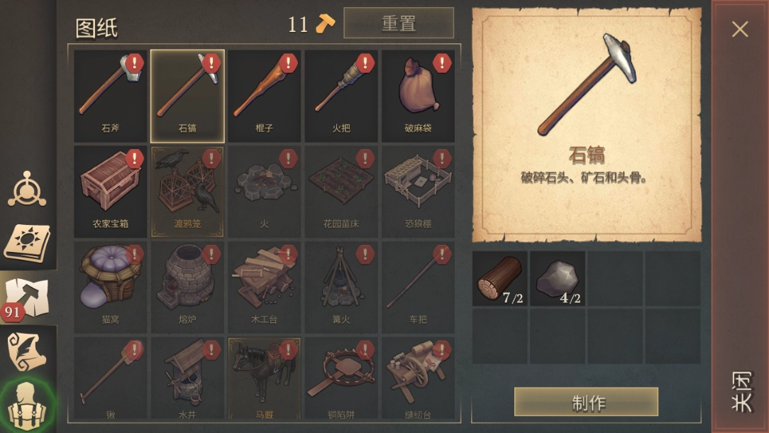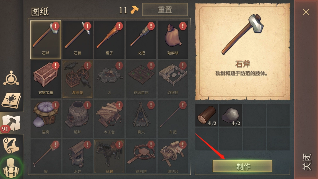 8、当资源逐渐增加时,就能制作出更多工具,制作完成后可通过左下角的按钮来进行装备;