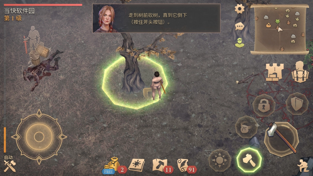 9、使用斧头持续点击树木直至砍倒;