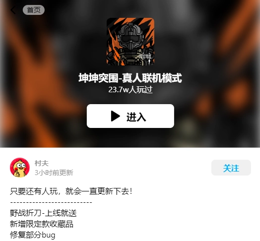 《坤坤突围像素版》是创游世界精心制作的一款小游戏,需在创游世界平台环境中运行。玩家只需通过本页面提供的创游世界入口,搜索“坤坤突围”,就能尽情体验游戏乐趣。