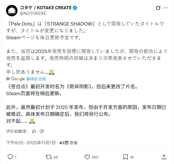《8号出口》的开发商KOTAKE CREATE通过官方推特宣布,其目前正在开发的新作,名称由“STRANGE SHADOW(奇异阴影)”变更为“Pale Dots(苍白点)” 。Steam页面将在稍后进行更新,同时还公布了该作品延期发售的消息。