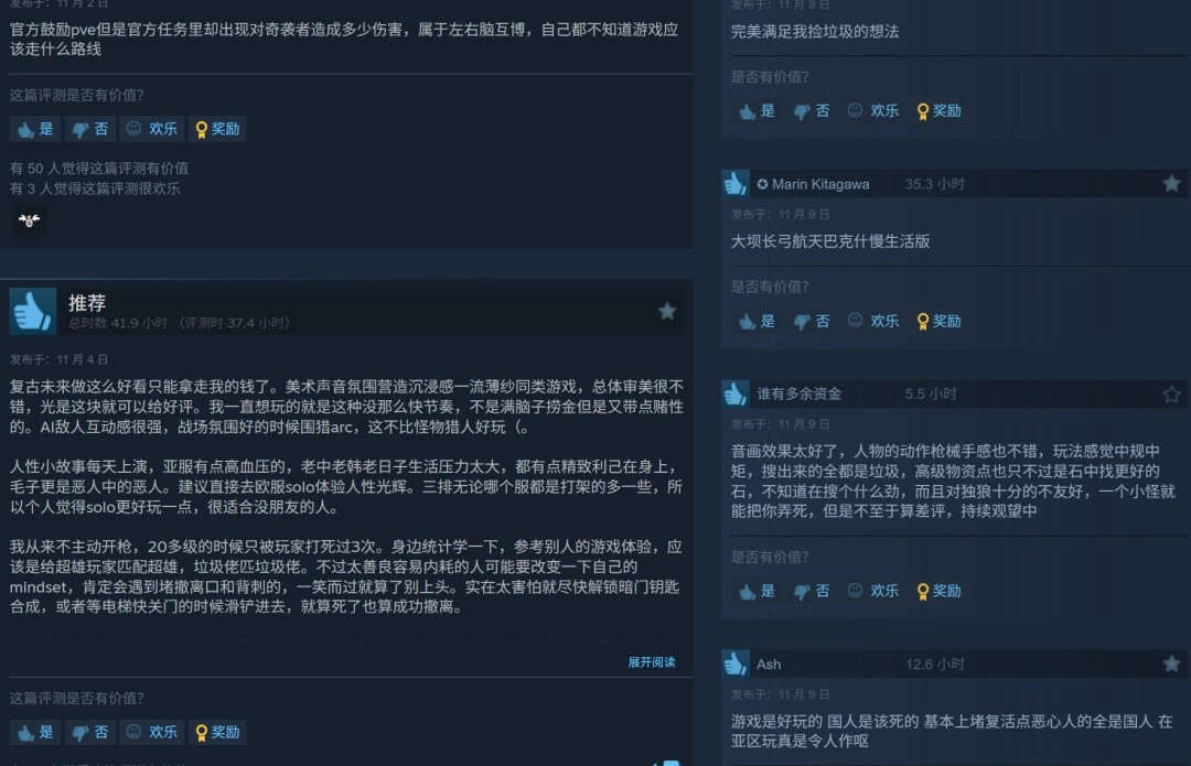 《Arc Raiders》在Steam上总体评测为特别好评,然而简体中文区的情况却不太理想,评价仅为“褒贬不一”。在1221篇简体中文评价里,仅有62%的玩家给予好评。