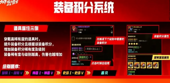 原有的5个积分阶段细化为新版本的16个阶段,,任一部位爆出更高品质装备即可提升积分,解锁“技能攻击力+X%”等阶段性加成。