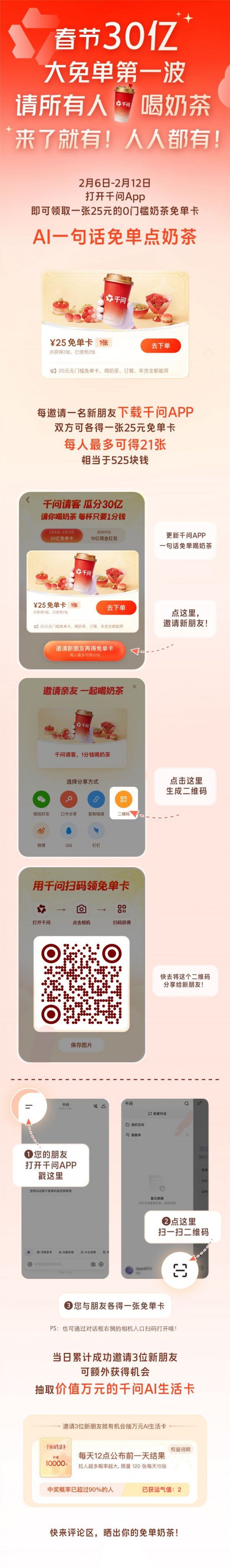相信经过几天的互联网ai红包的攻击,很多小伙伴都收获满满,而千问此次活动力度是最大的,2.6-2.12的免单卡活动,让很多小伙伴都领取到了让自己满意的免单卡张数,不仅能用来点外卖奶茶,还能上淘宝闪购等平台购买你需要的年货哦,而且除了购物之外,飞猪平台拼车也能用于抵扣,覆盖了衣食住行的多个方面,千问春节瓜分30亿红包火热进行,第二阶段即将开启!你做好准备了吗? 第二阶段春节10亿红包详细内容: 千问的【春节分10亿】活动是“千问请客·瓜分30亿”系列活动中的第二波,将于2月14日0点正式开启。 邀请亲友领红包,他领多少您领多少! 累计最高2888元现金等您来领~ 并且除夕夜(2月16日)还有红包雨随机掉落大额红包和千问AI眼镜~ 第一阶段内容: 第一阶段免单卡活动已经于2.6日开启,于2.12日结束,目前还没集齐或者还没开始的朋友抓紧了。 第一波活动,以奶茶免单为核心,叠加邀请福利与后续活动,具体信息如下: 一、活动规则(第一波:2 月 6 日 - 2 月 12 日) 基础免单权益:所有用户更新千问 App 至最新版,可直接领取 1 张25 元无门槛免单卡,适用范围包括全国 30 多万家奶茶店(如蜜雪冰城、瑞幸咖啡、奈雪的茶等),还可用于淘宝闪购买年货、点外卖,免单卡最晚使用至 2 月 23 日。 邀请得额外免单卡:每成功邀请 1 名新朋友下载千问 App,邀请者与被邀请者双方各得 1 张 25 元免单卡,每人最多可累计获得 21 张(相当于 525 元)。 邀请抽万元权益:当日累计邀请 3 位新朋友,可额外获得抽取价值万元千问 AI 生活卡的机会,每天 12 点公布前一天结果,每天限量 15 张,活动期间共 120 张。 二、活动补充信息 AI 便捷下单:千问 App 已接入淘宝闪购、支付宝、飞猪、高德等阿里生态场景,支持 “一句话下单”,无需跳转多平台即可完成消费。 第二波活动预告:2 月 14 日起开启第二波活动,用户可领取现金红包,最高金额 2888 元。