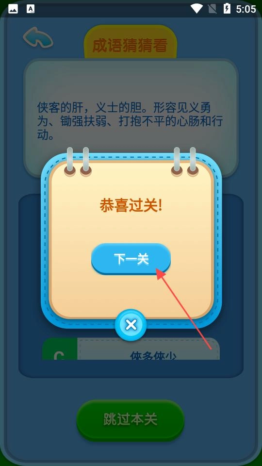 若答案正确,界面会弹出恭喜过关的提示,点击提示里的“下一”按钮,就能进入新的成语猜猜看题目场景,继续推进游戏挑战的进程。