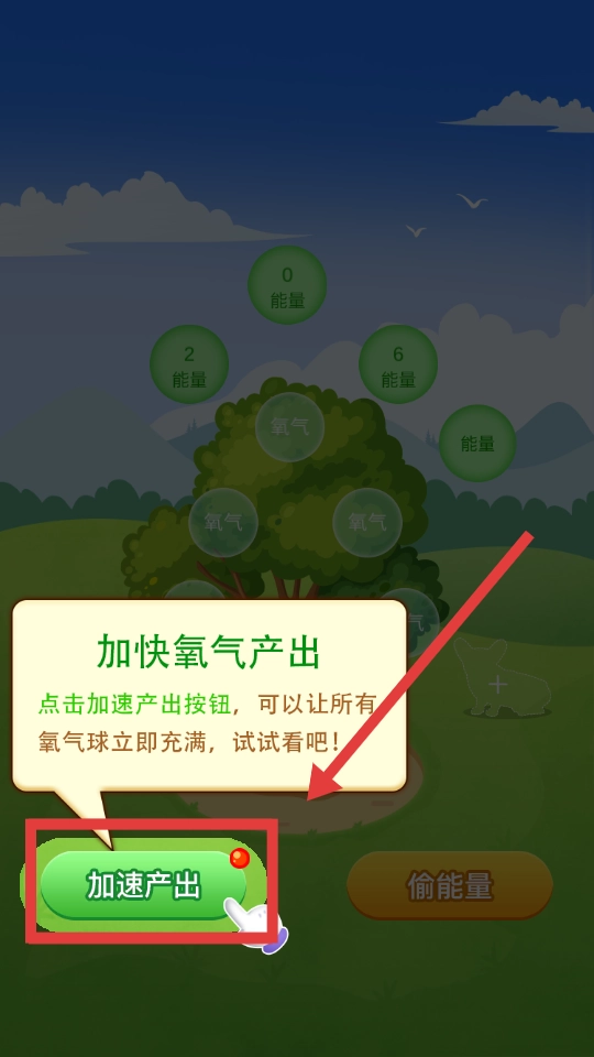 当你需要快速获取氧气时,点击界面上的加速产出按钮,就能让所有氧气球瞬间充满,从而加快氧气的获取速度,推动游戏进程向前发展。