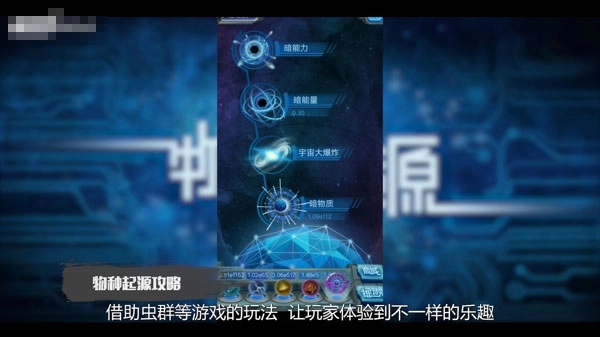 首先给大家解释一下大爆炸机制——通俗来讲,这里的“大爆炸”就相当于其他游戏里的“转生”,而“暗物质”则对应着放置类游戏中转生后得到的“转生币”。放置游戏的核心目标通常是不断推进关卡层数,要实现这一点,就得通过反复转生获取转生币,再用这些资源学习技能、购买装备、提升等级,以此加快推层的效率。同理,在这款游戏里,核心目标是创造新物种,而通过大爆炸获得的暗能量,可以用来学习技能,从而加速新物种的创造进程。