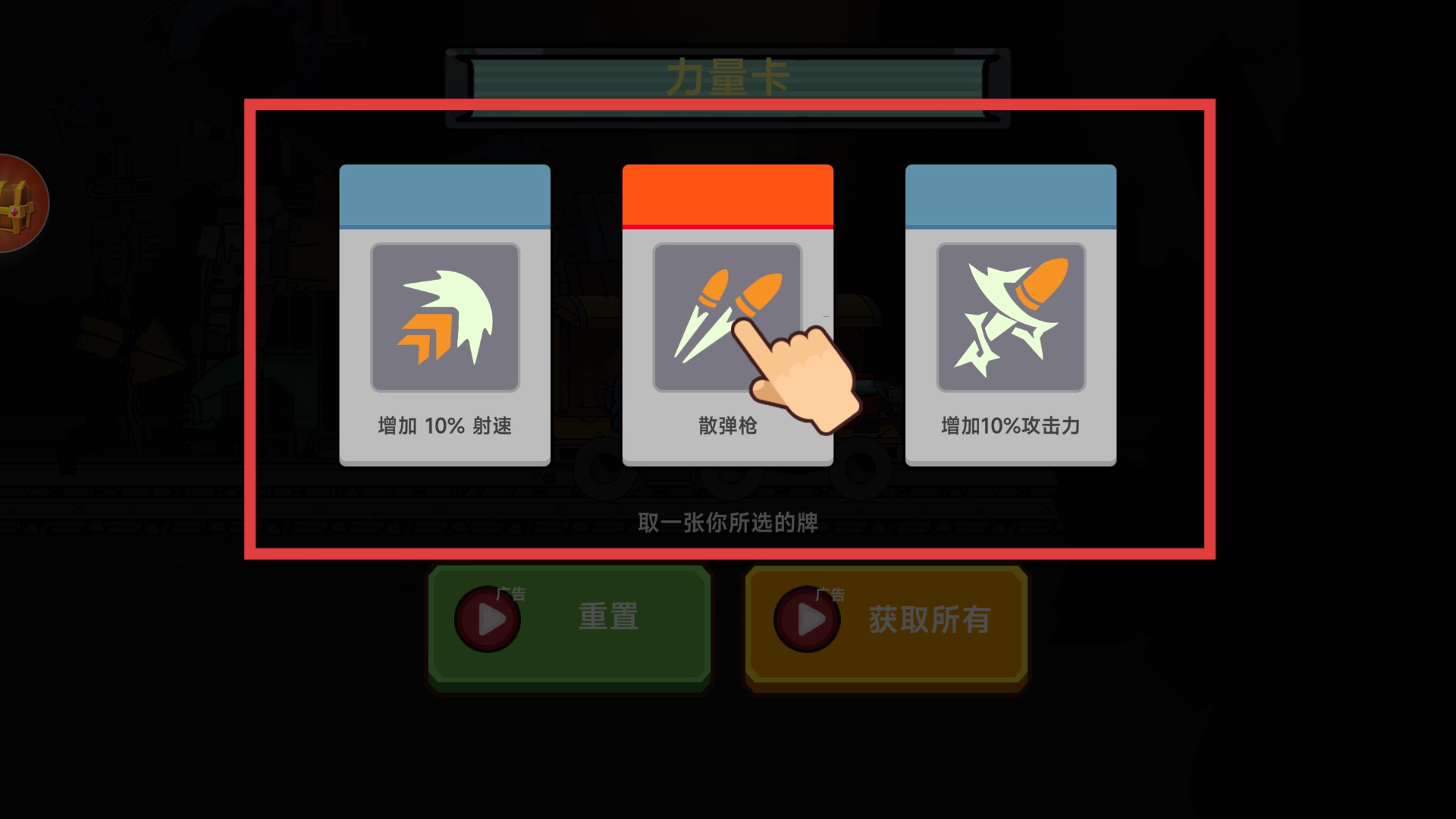 游戏进行时会弹出力量卡选择界面,你可以依据当下的局势与自身需求,点击挑选一张力量卡,这样能强化角色的战斗能力,更高效地抵御僵尸的攻击,从而提高通关的可能性。