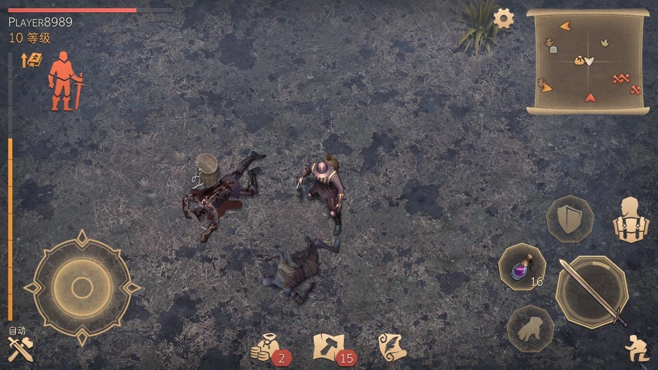 再说说自动战斗的问题:副手拿火把时,遇到实力相当的NPC想击杀怎么办?可以提前准备:靠近NPC时点开自动战斗,然后打开背包喝两口加工过的血,再关掉背包看胜负——一般都能赢,怕输就多喝两口。