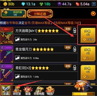 点击左上角的自动升级按钮,即可选择武器并开启自动强化功能。
