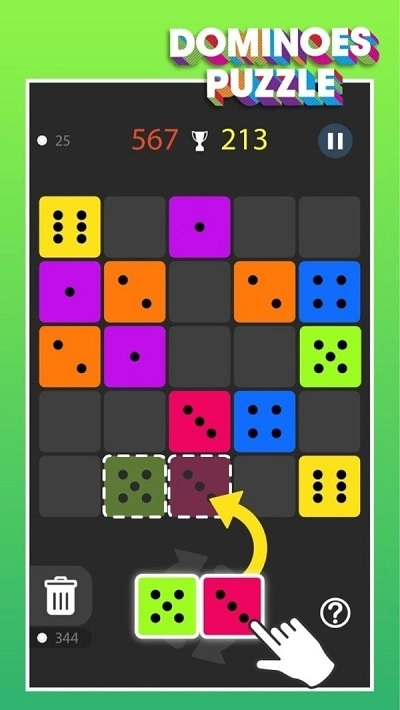 这是一款颇具趣味的合并类休闲游戏。在游戏里,玩家要把三个颜色与点数都完全一样的骰子合并起来,以此达成消除效果;同时,也能借助下方的旋转功能来调整骰子的点数。另外,还可以将三个编号相同的方块相邻摆放,通过水平、垂直或者两种方式结合的形式来完成合并操作,而且在放置方块之前,同样能够对其进行旋转调整!