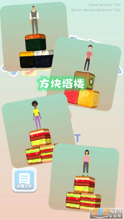 的叠高高游戏,玩家需要动手建造,把不断掉落的物品堆叠起来。可供堆叠的物品丰富多样,有蛋糕、水果、饭团等。堆叠时要尽量摆放整齐,这样才能让塔更稳固,避免倒塌,自己操控的小人也能站得更高。《方块塔楼安卓版》是一款