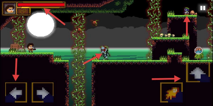 游戏操作界面布局清晰,顶部的血量条设计直观醒目;左侧移动按钮与右侧攻击按钮的区分度高,操作逻辑一目了然。画面呈现上,敌人形象与场景细节刻画丰富细腻,玩家可操控角色穿梭于草丛之间,与各类怪物展开对抗,尽情沉浸在横版冒险的战斗体验之中。