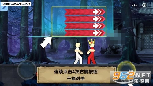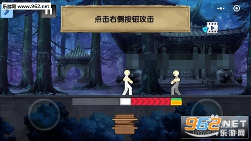 看到那个白色小人了吗?那就是我们在游戏里的角色哦。要是看到敌人过来了该怎么做呢?当然是靠近他们啦!我们左边的按钮能帮我们移动、接近敌人,然后按下右边的按钮——咔咔咔——就能把他们打败啦。