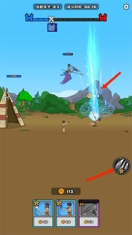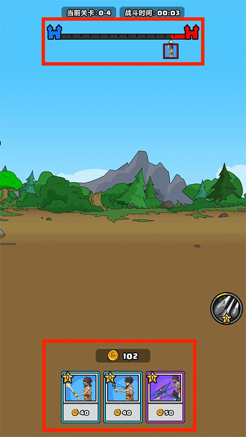 进入战斗界面后,我们可以点击下方的战士来让他们加入战斗,不同的战士需要消耗对应的金币。上方的蓝色条是我方的进度条,率先抵达并摧毁对方基地的一方即为获胜方。