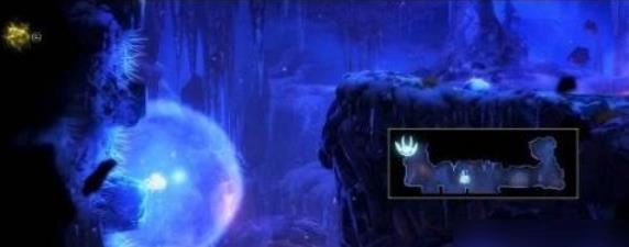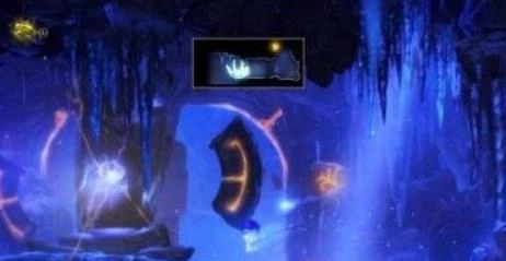 进入荒芜废墟后,向左行进,借助跳跃与滑翔越过两处滚烫的落脚点,抵达前方区域,便能看到古时古门所发明、用于储存精灵之树光芒的光明容器。
