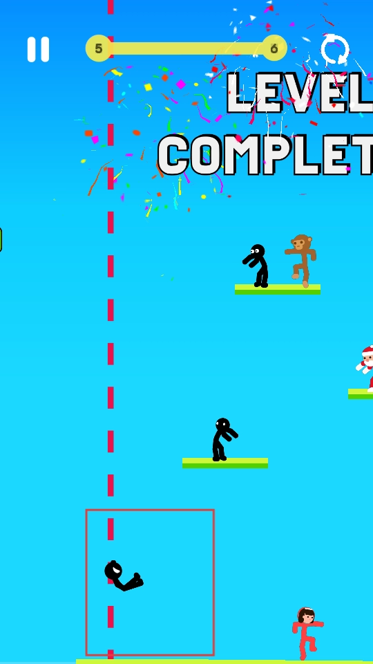 长按屏幕操控火柴人秋千摆动,借助惯性调整角度,松开手指使其跃起,越过下方障碍,准确落在平台上。