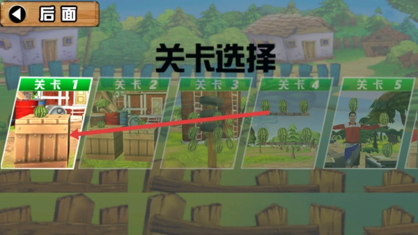 点击“开始”按钮后,页面会跳转至关卡选择界面,此时选择“关卡1”即可进入游戏。该关卡的场景中包含木箱等道具元素,点击确认后就能开启第一关的挑战。