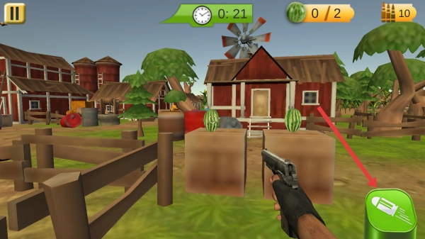 在第1关的战斗环节,你需要操控枪械去射击农场里的目标,也就是西瓜。过程中要留意剩余时间显示为0:21,以及当前收集到的数量是0/2。要是弹药不够了,就点击右侧的绿色技能按钮来补充弹药,这样就能完成这一挑战啦。