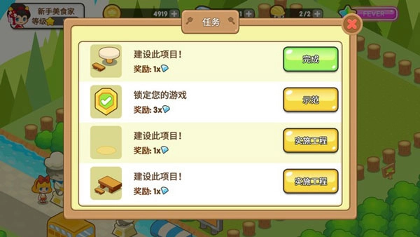 在这款游戏中,食材无法通过购买获取,唯一的途径是通过大热买来获得。当右上角的“Fever”标志开始闪烁时,就意味着可以开启大热买了。完成大热买后,会获得食材或钻石作为奖励。在大热买期间,每座建筑物都会持续不断地产生利润。