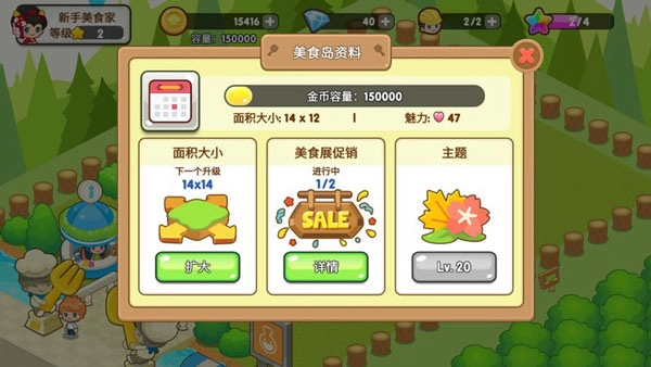 随着游戏进程推进,我们得对美食城进行整体扩张。只要点击屏幕上那个蓝色感叹号,就能选择扩张操作。扩张面积最关键的就是资金,所以务必多赚钱呀!另外,在这里还能查看美食城的当前状况呢!